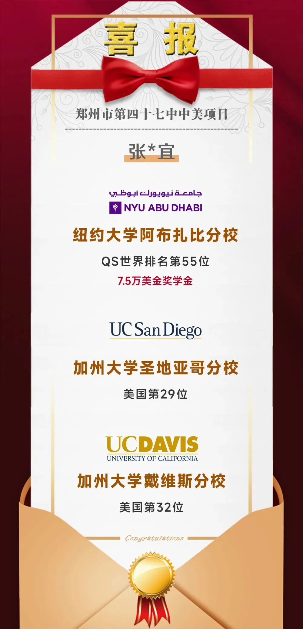 此外,张*宜同学被纽约大学阿布扎比分校录取,并获7.5万美元奖学金——这所录取率常年低于常春藤、被誉为“全球最难进大学之一”的顶级学府,以全奖资助与极致多元的全球视野著称,47中学子的成功突围,标志着我们已具备与世界顶尖精英同台竞技的底气。