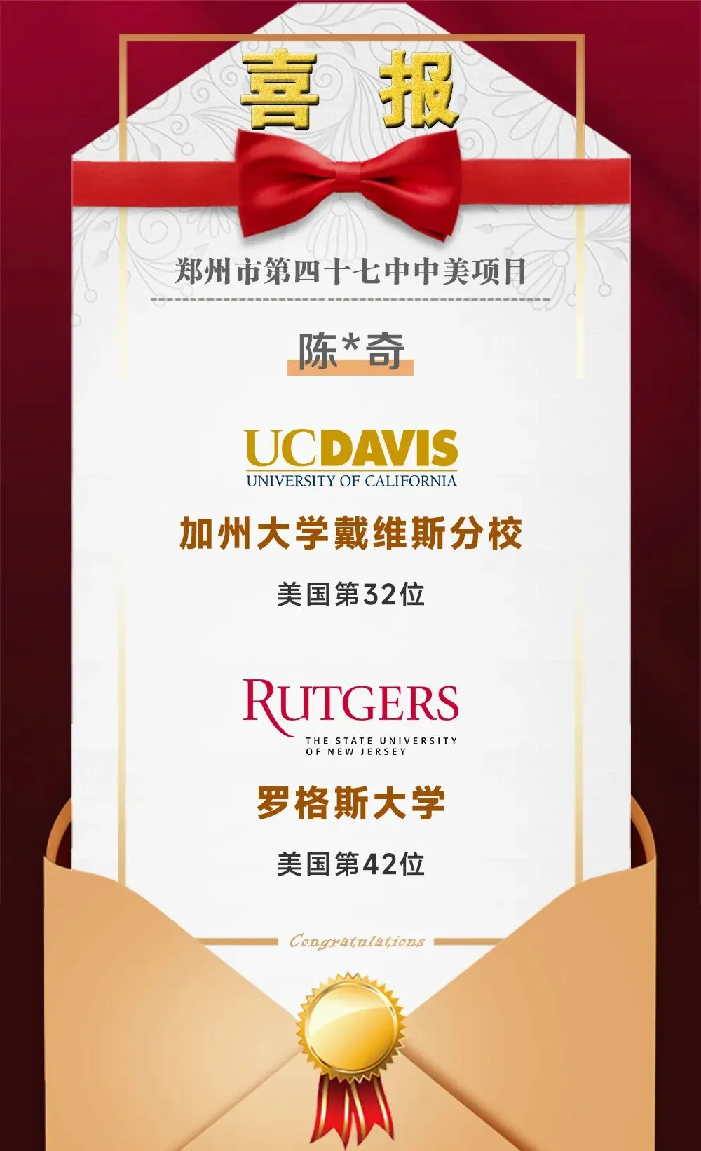 热烈祝贺陈*奇、张*宜同学获“公立常春藤”——加州大学圣地亚哥分校、加州大学戴维斯分校和美国第八古老的高等学府——罗格斯大学录取,印证了我校学子的学术硬实力;
