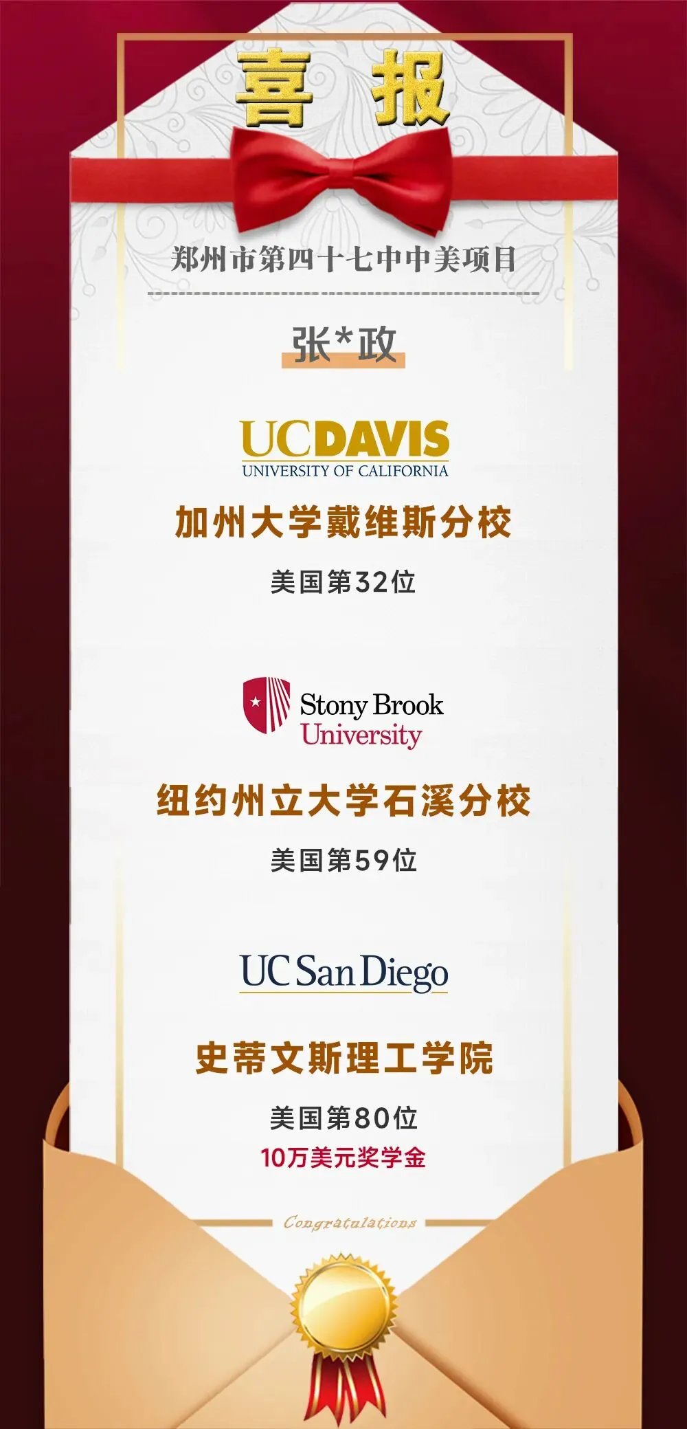 张*政同学获得加州大学戴维斯分校、纽约州立大学石溪分校和精英学府史蒂文斯理工学院录取,并获得10万美元奖学金;