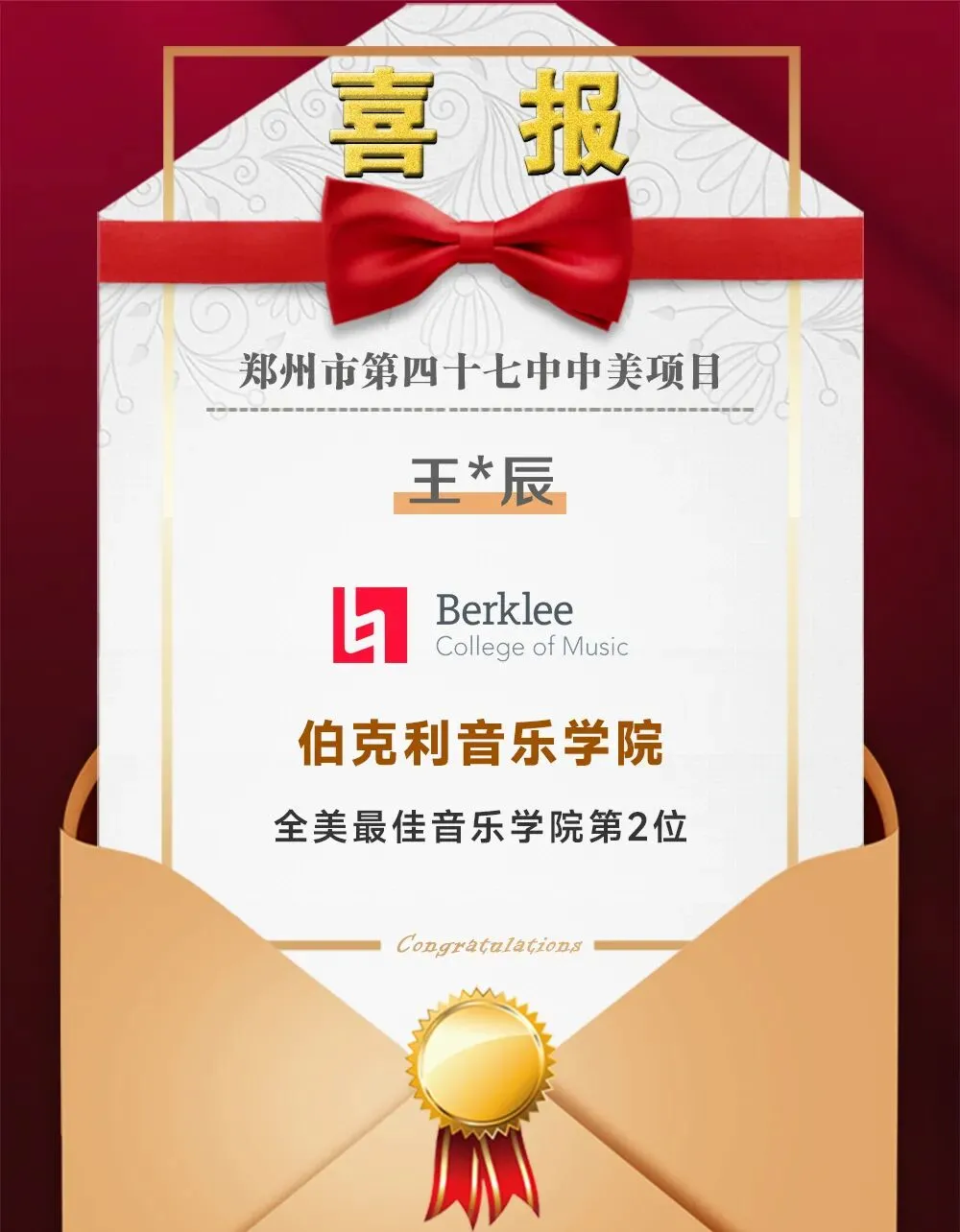特别值得关注的是,王*辰同学成功叩开伯克利音乐学院的大门,这也是47中中美班&剑桥A Level班历年来第4位进入世界音乐殿堂级学府的学生。