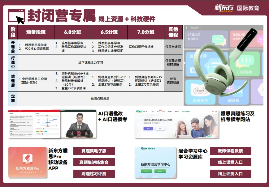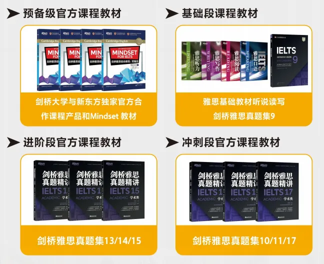 · 官方定制教材:使用剑桥大学出版社与剑桥大学外语考试部联合研发的《Mindset for IELTS》系列,新东方独家落地出版。