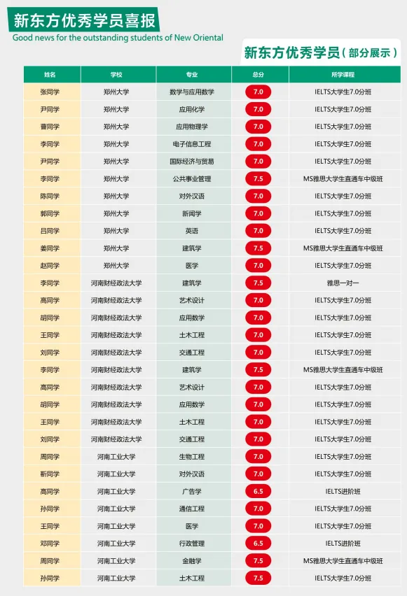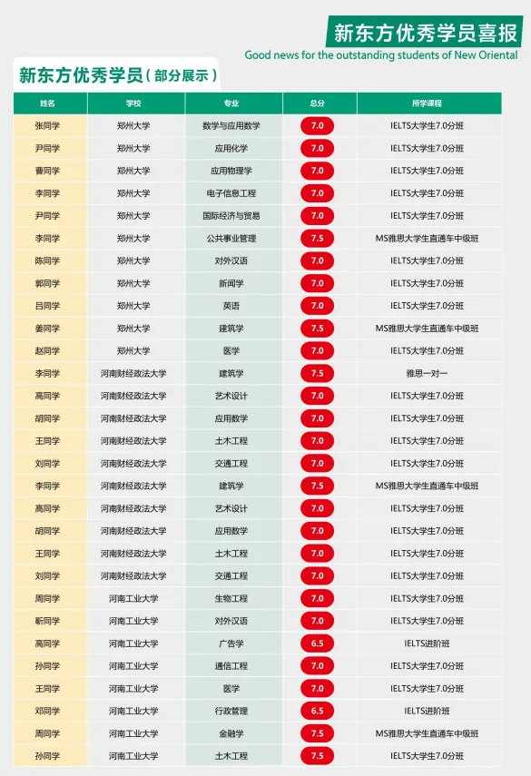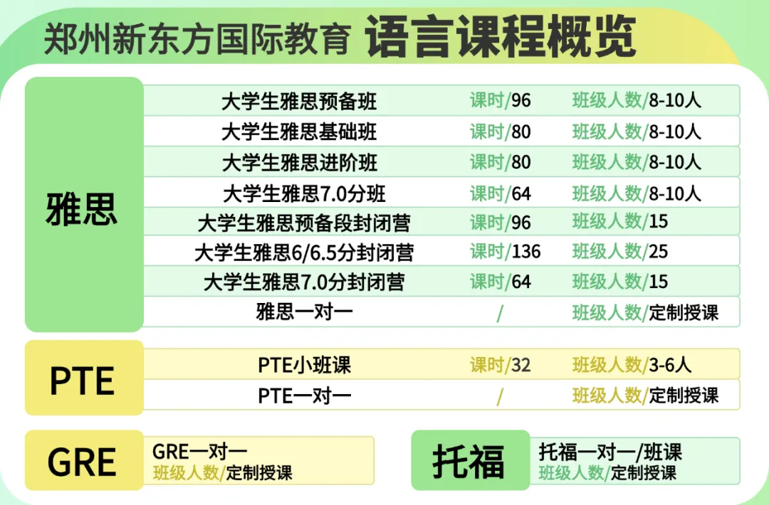 除了雅思课程,郑州新东方还提供托福、GRE、PTE、成人综合英语等课程...
