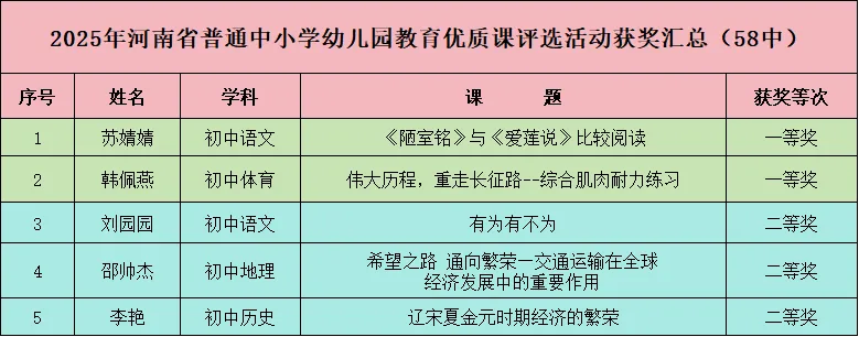 热烈祝贺郑州市第五十八中学5位教师在2025年河南省普通中小学幼儿园教育优质课评选活动中,凭借深厚的专业素养与精彩的课堂表现脱颖而出,荣获奖励!苏婧婧和韩佩燕2位教师荣获省级一等奖,刘园园、邵帅杰和李艳三位教师荣获省级二等奖。