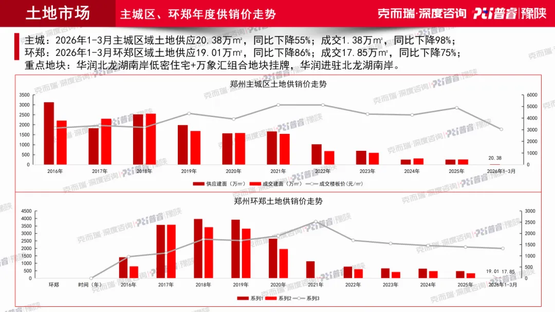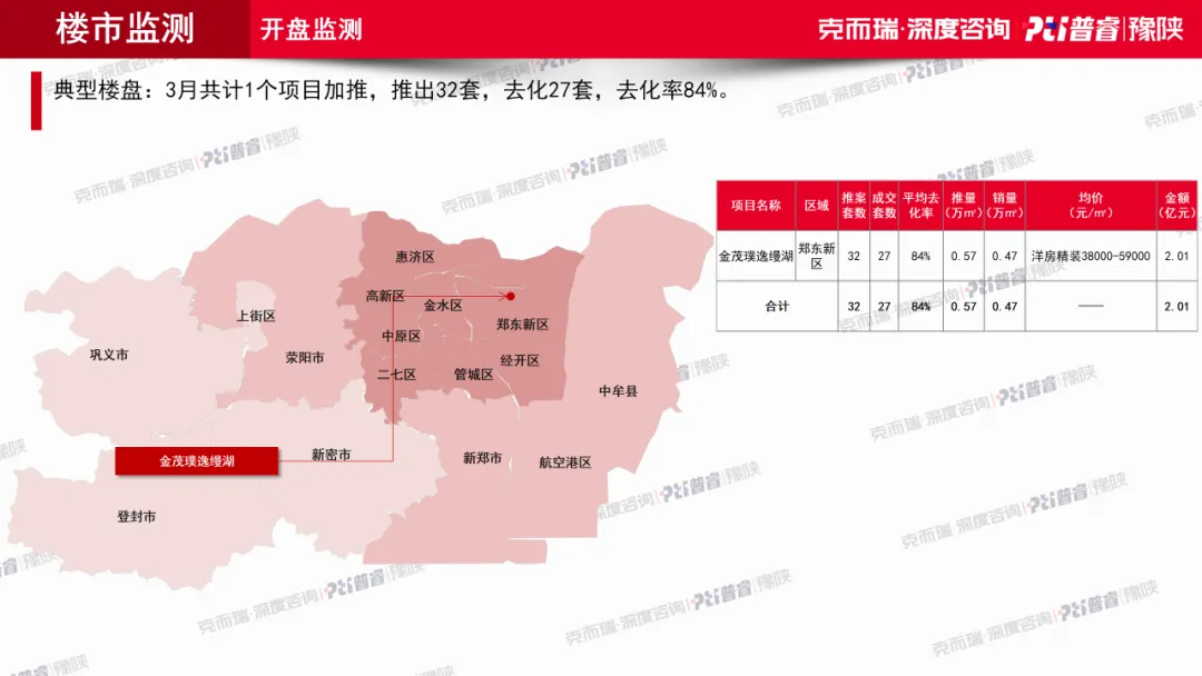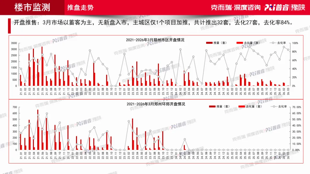 到了3月,市场真正发生变化的地方,不在开盘端,而在成交端。全月主城区依然只有1个项目加推,推出32套、成交27套,去化率84%,从新增供应看并不强。但与此同时,主城区商品住宅成交面积达到26.45万㎡,环比增长86%;环郑住宅成交面积达到16.95万㎡,环比增长92%。