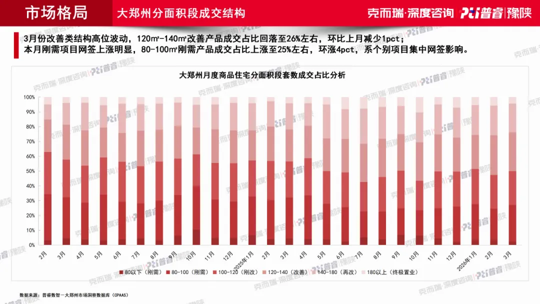 但到了3月,80-100㎡刚需产品成交占比升至约25%,环比提高4个百分点,而120-140㎡改善产品占比则回落至约26%。