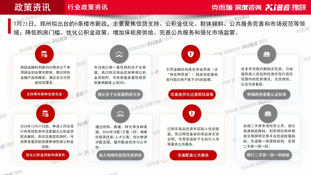 1月和2月的政策基调更多偏向金融支持、住房保障与市场预期稳定;3月则出现更具交易激励色彩的政策组合。尤其是郑州拟出台的“郑八条”,包括按行政区认定首套、多子女家庭公积金额度上浮、青年金融支持、改善型住房按首套公积金政策执行,以及二手房一房一码等。