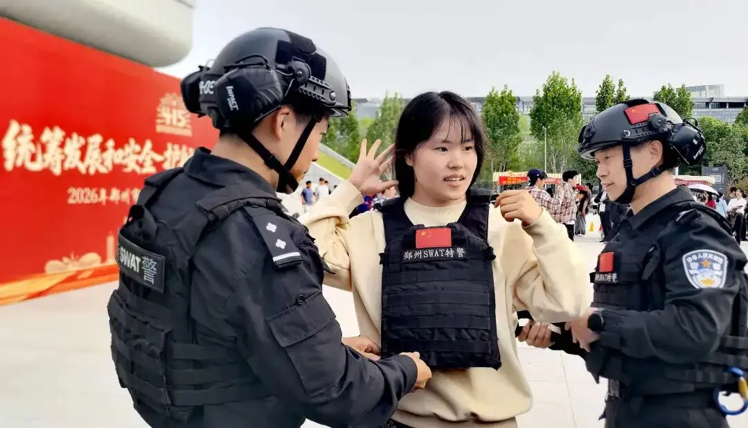 14日下午3时,在河南中医药大学体育馆西门广场,各类普法安全教育宣传展台一字排开,内容涵盖反恐防暴、反间谍、防范电信网络诈骗多个领域。在特警展台前,特警装甲车等警用装备吸引了大批学生驻足,他们在民警引导下近距离观摩高精度狙击步枪、警用无人机等装备,并争相试穿防弹背心、佩戴防暴头盔,亲身体验“特警力量”。派出所民警则通过“安全知识问答”等互动游戏,将常见骗局融入趣味挑战中,学生们在答题赢奖的同时,进一步提升识诈防诈能力。
