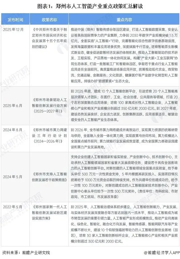 郑州市人工智能产业拥有较为完善的政策环境,相关政策覆盖不同发展阶段,形成了系统性的支撑体系。2022年,郑州市出台相关实施方案,明确到2025年人工智能核心产业和相关产业规模分别超过300亿元和2000亿元,计划建设创新创业基地、培育创新标杆企业。2024年,先后发布算力网建设行动计划和支持人工智能创新发展的政策措施,前者明确到2026年建成城市算力网络并进入全国重点城市前列,后者对新创建的人工智能领域高能级创新平台给予资金奖补。2025年,发布场景驱动行动方案和“十五五”规划建议,明确2025年底和2027年底的发展目标,推进园区建设、实施“人工智能+”行动、开放应用场景,力争到2030年数字产业规模突破1.5万亿元,推动人工智能产业持续发展。
