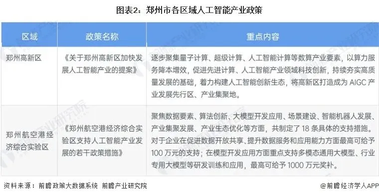 郑州高新区与郑州航空港经济综合实验区结合自身产业基础,分别出台人工智能产业相关政策,形成差异化支持导向。郑州高新区围绕算力集聚与生态构建,提出汇聚量子计算、超级计算、人工智能计算等数算产业要素,以算力服务推动科技创新,着力打造AIGC产业发展先行区与产业集聚地。郑州航空港经济综合实验区出台18条具体支持措施,聚焦数据要素、算法创新、大模型开发应用、场景建设、产业集聚等方面给予扶持,对数据服务类项目最高给予100万元支持,对多模态通用大模型、行业专用大模型研发训练和应用最高给予1000万元奖补,两地政策分别侧重算力生态建设与产业要素奖补,共同支撑郑州市人工智能产业发展。
