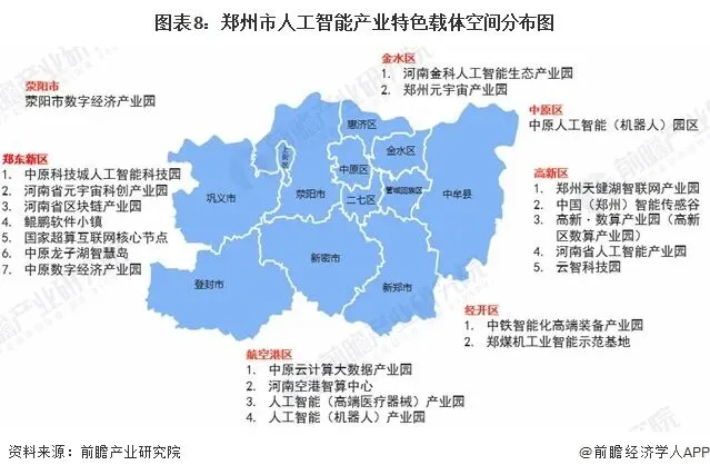 我市人工智能产业发展格局整体呈现“两核引领,三区协同,多点联动”。“两核引领”即以郑东新区和高新区为核心。郑东新区规划建设了中原科技城人工智能科技园、河南省元宇宙科创产业园、河南省区块链产业园、鲲鹏软件小镇等7个人工智能园区。高新区规划布局了郑州天健湖智联网产业园、中国(郑州)智能传感谷、高新区数算产业园等5家人工智能园区;“三区协同”即以金水区、经开区和航空港区为主,聚集了河南金科人工智能生态产业园、郑州元宇宙产业园、中铁智能化高端装备产业园、郑煤机工业智能示范基地、中原云计算大数据产业园等8家人工智能园区;“辐射多极”即以荥阳、中原、二七等区县(市)依托创新综合体、创新孵化器、创客中心等,规划建设了荥阳市数字经济产业园、中原人工智能(机器人)园区等产业集聚区,形成了辐射带动效应。