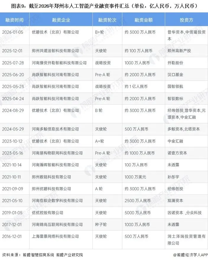 截至2026年2月,郑州市人工智能产业融资整体活跃度稳步提升但仍处成长期。从时间看,2021—2026年累计披露融资事件16笔,融资金额约2.8亿元人民币(含1000万美元),2025年融资热度回升,全年完成5笔融资,尚跃智能、优碧技术等企业连续获投,显示资本对本地AI企业认可度提升。从轮次看,以天使轮、Pre‑A轮等早期融资为主,占比超70%,B轮及以后成熟项目较少,反映产业仍以初创培育为主。从金额看,单笔融资多在千万级及以下,仅尚跃智能获1亿元战略投资,整体规模偏小。从主体看,本地资本(郑州高新产投、豫资开勒等)与省市区引导基金活跃,外部机构(普华、经纬、中信建投等)逐步参与,2025年10亿元河南汇融人工智能产业基金落地,强化了政府引导与资本协同。从企业看,优碧技术、尚跃智能等少数企业获多轮融资,成为资本聚焦标的,多数企业仍处早期融资阶段。