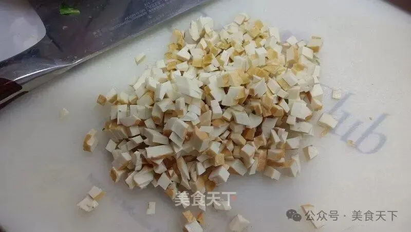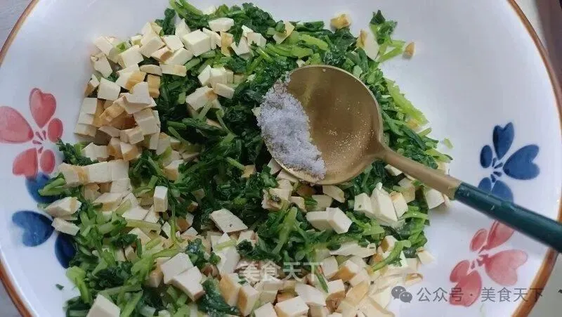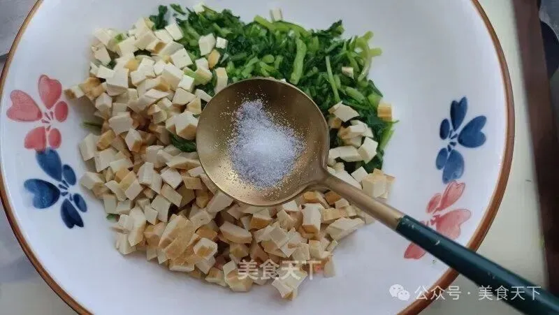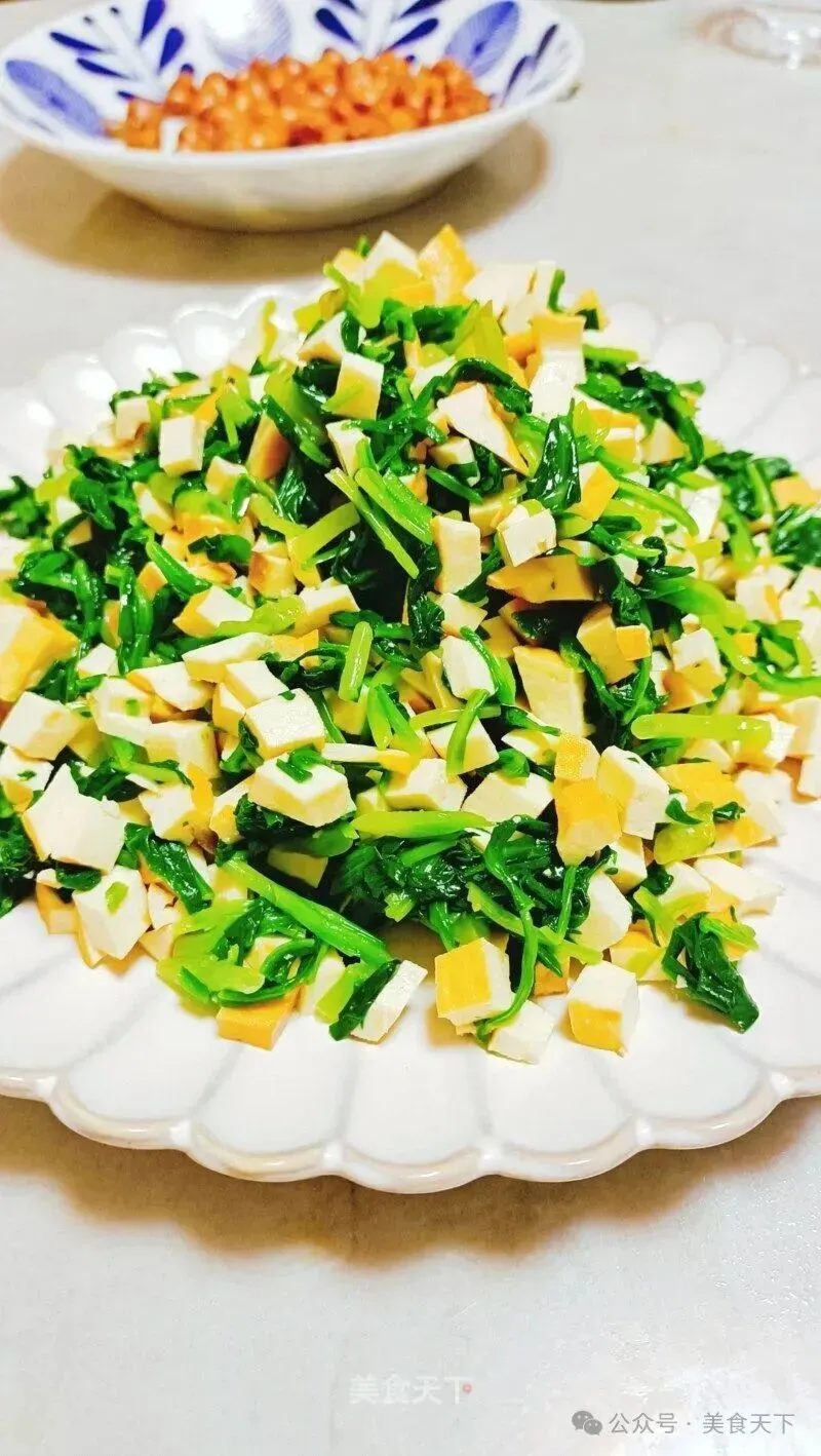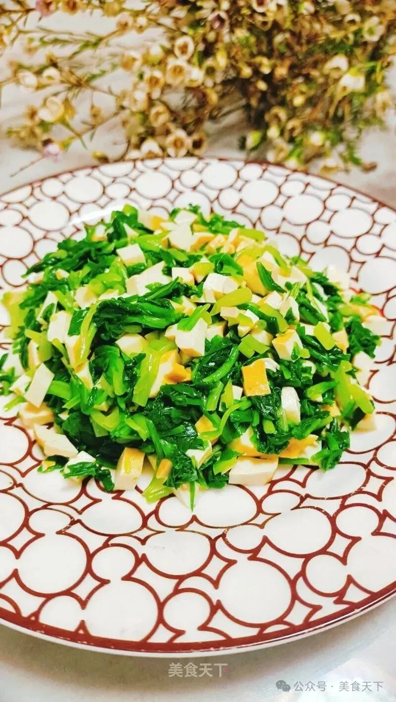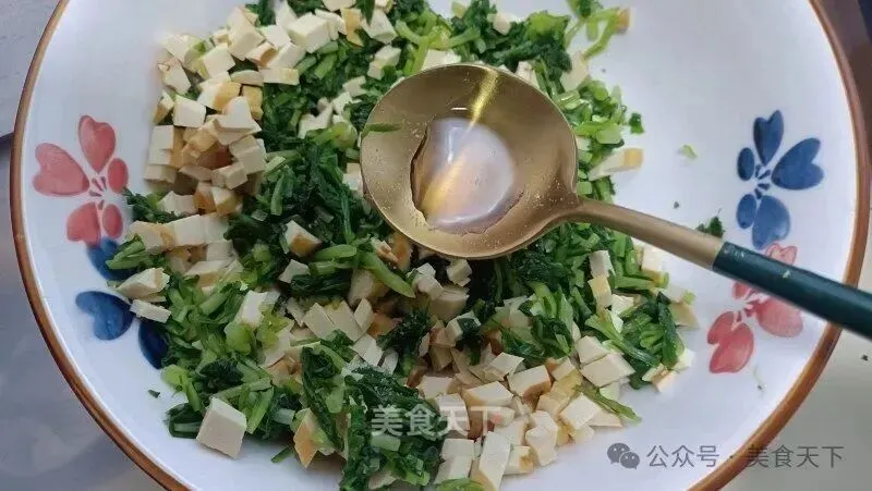 马兰头半斤、五香豆干三小块、盐适量、香油适量、糖少量。