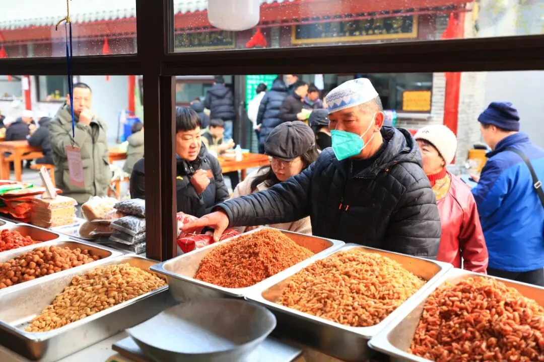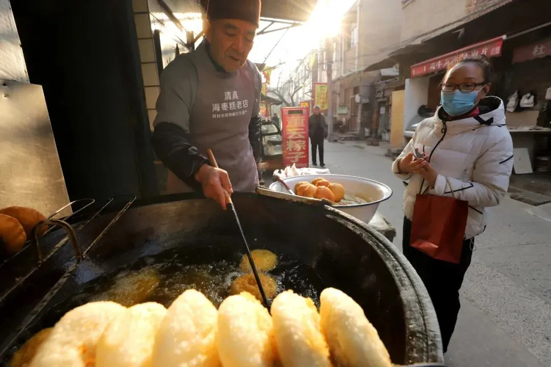 顺河坊,开封美食的汇聚地。想要品尝开封本地人打卡的小店,来顺河坊的寺门美食广场准没错。四味菜、炸枣糕、锅盔……多少开封人从小吃到大的美食,在这里可以一次吃个够。