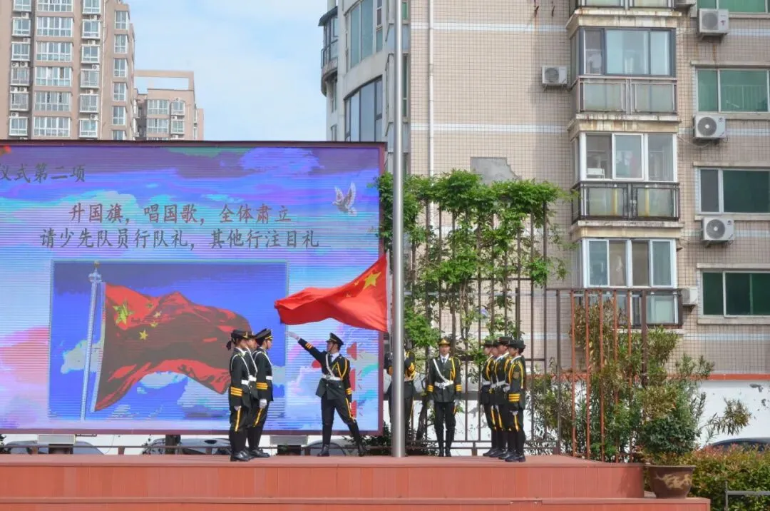 伴随着雄壮的《义勇军进行曲》,鲜艳的五星红旗冉冉升起。全体师生肃立注目、高唱国歌,现场庄重肃穆。校国旗护卫队步伐铿锵,圆满完成护旗任务。