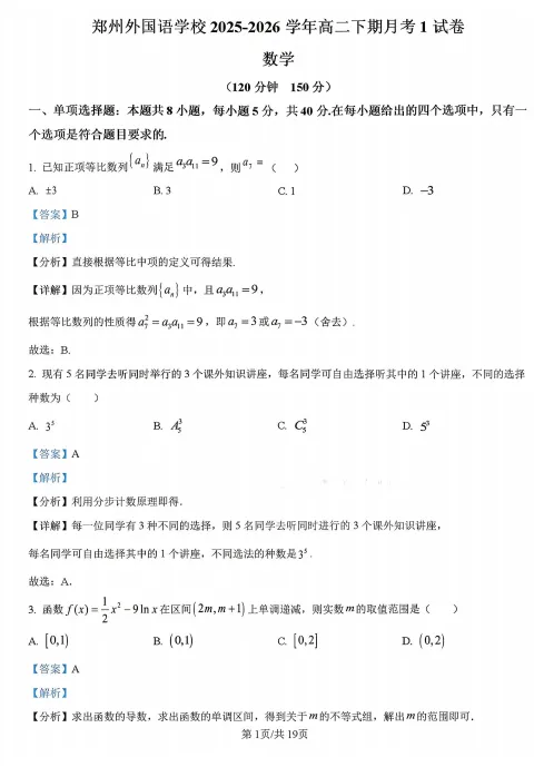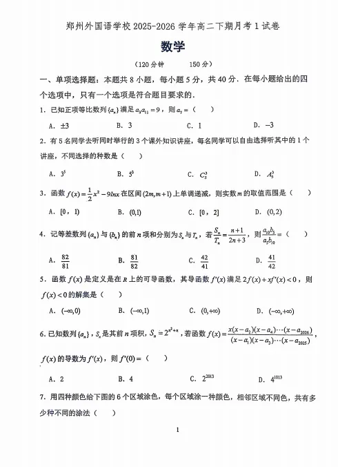 【高二】月考丨河南郑州外国语2025-2026高二下学期阶段检测1