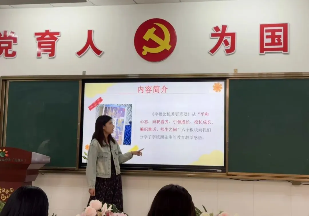 黄云云老师分享李镇西《幸福比优秀更重要》。她阐明了优秀是外界评价,幸福源于内心。她倡导教师坚守教育初心,保持热爱,坚持阅读与写作,善待学生与自己,不被功名裹挟,立足课堂与陪伴,在育人与成长中收获真实幸福,做幸福的教育人。