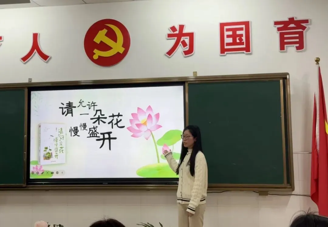 柴蓉老师分享了《请允许一朵花慢慢盛开》这本书,她认为教育是慢的艺术,贵在耐心与守望。书中传递出“尊重每个孩子的成长节奏”这一核心理念,提醒教师放下焦虑,摒弃急功近利。每个学生都是一颗独特的种子,花期不同,绽放的方式也各异。教育者应学会静心陪伴、温柔等待,在日复一日地耕耘中看见孩子的点滴进步。教学上要少一些催促,多一些鼓励;少一些比较,多一些包容。以爱为光,以时间为壤,让每一朵花都能在自己的季节里安然盛开。