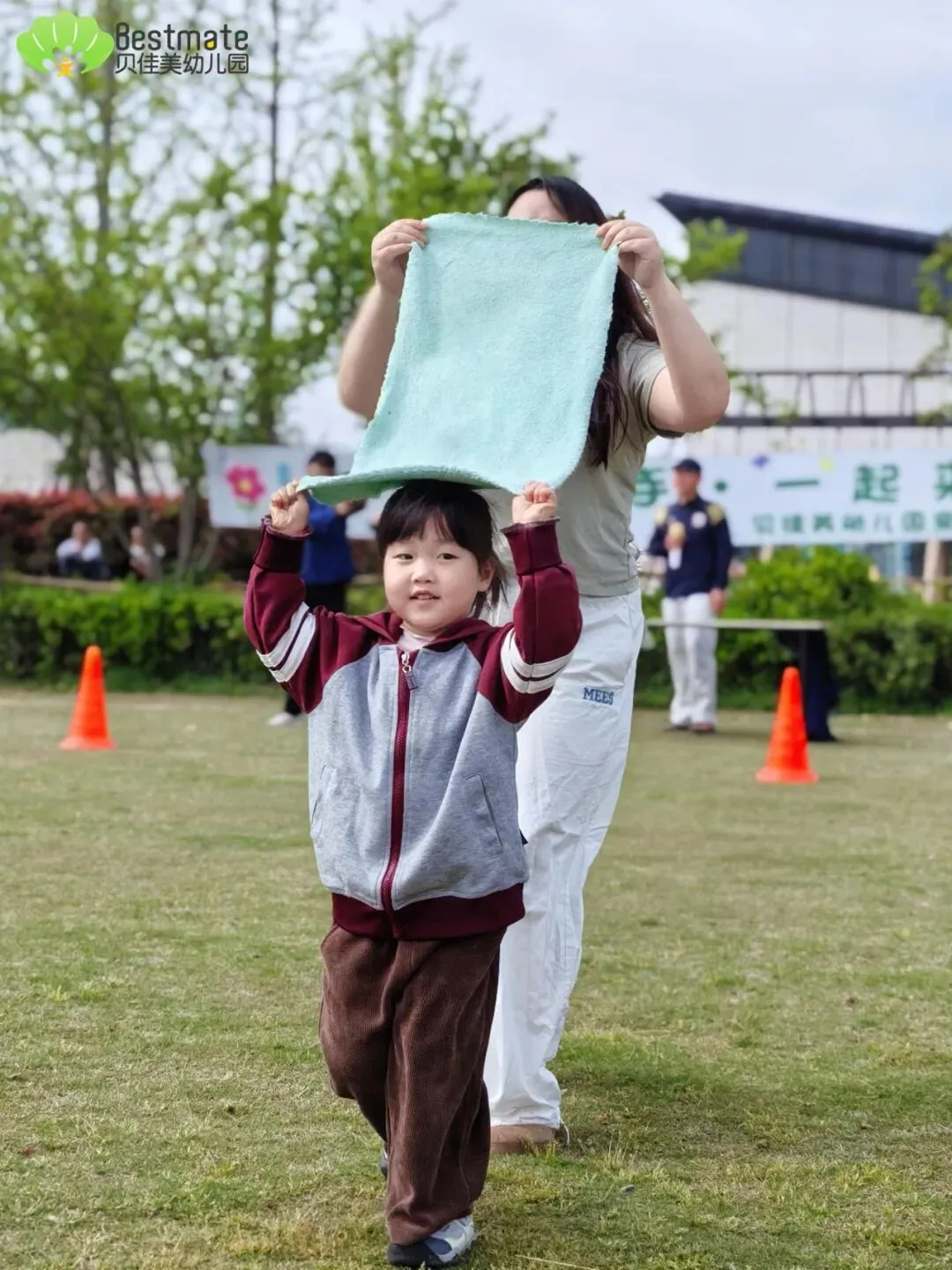 家长与宝贝自带毛巾,搭配蓝红交通锥,划分清晰活动区域;