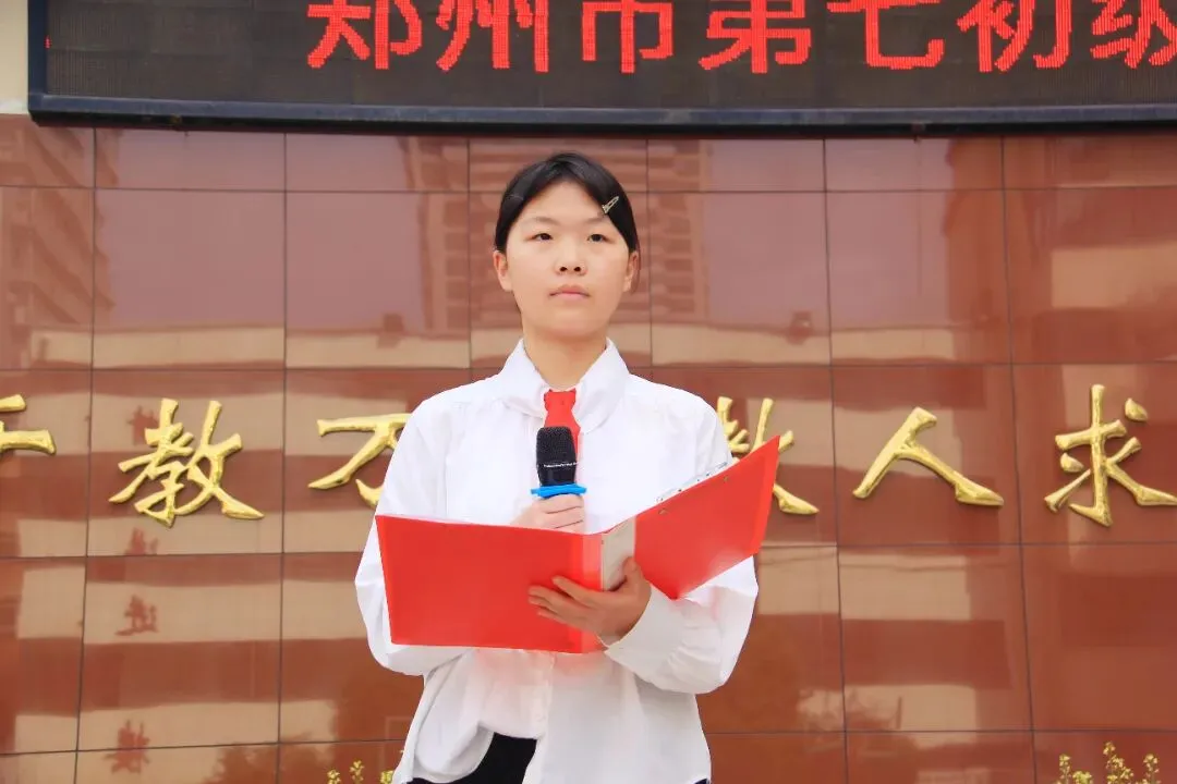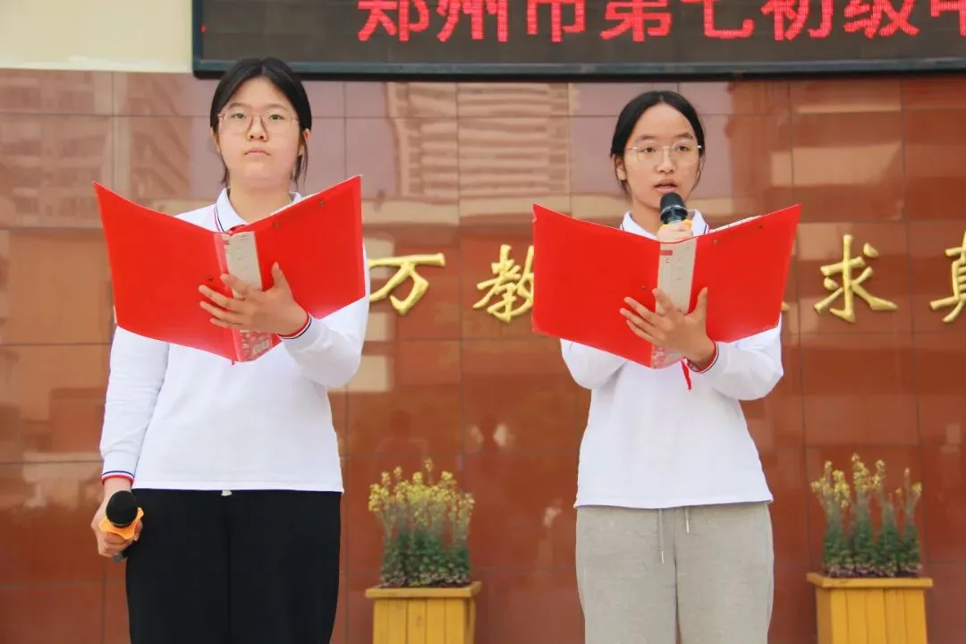 为引导学生爱上阅读、以读启智,4月13日,郑州市第七初级中学东校区举行了以“书香润心灵 阅读伴成长”为主题的升旗仪式,以经典润心,以书香赋能成长。在这庄严而神圣的升旗仪式上,我们以书为友,以读为伴,共同开启一场浸润心灵的成长之旅,让悠悠书香洒满校园的每一个角落。本次升旗仪式由王笑笑同学主持。