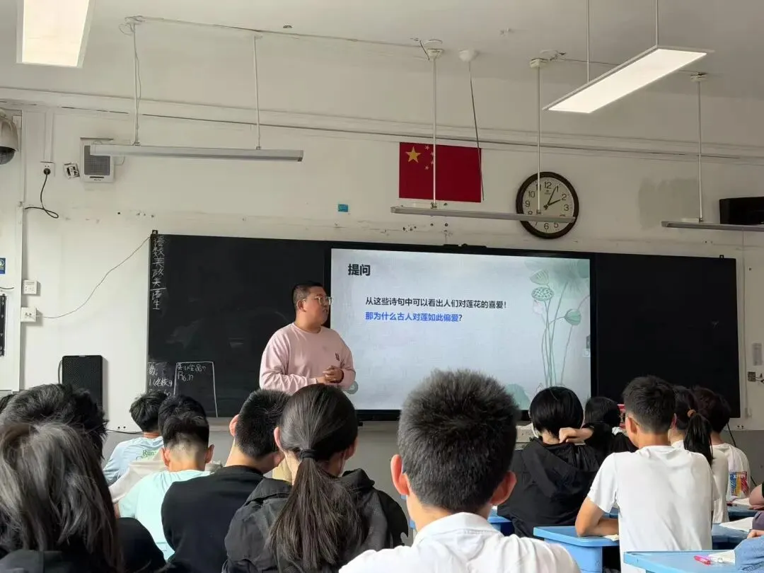 首先,郭伟老师以课文《爱莲说》为主题,为大家呈现了一堂生动的教学展示。课堂以传统文化中“莲的品格”为导入,通过朗读感知、文意疏通、主旨探究、对比阅读等环节,层层深入引导学生理解托物言志的写法。课堂既夯实文言基础,又浸润君子品格,充分体现了文言文教学的韵味与厚度。