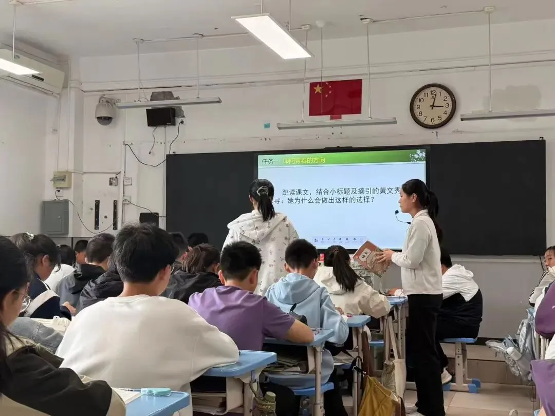接着,李亚旗老师以《青春之光》为主题,带领学生走进黄文秀的扶贫故事。教师以核心问题为牵引,聚焦人物细节,引导学生在文本研读中感悟责任与担当,课堂情感真挚、立意深远,实现了语文育人与价值引领的有机融合。