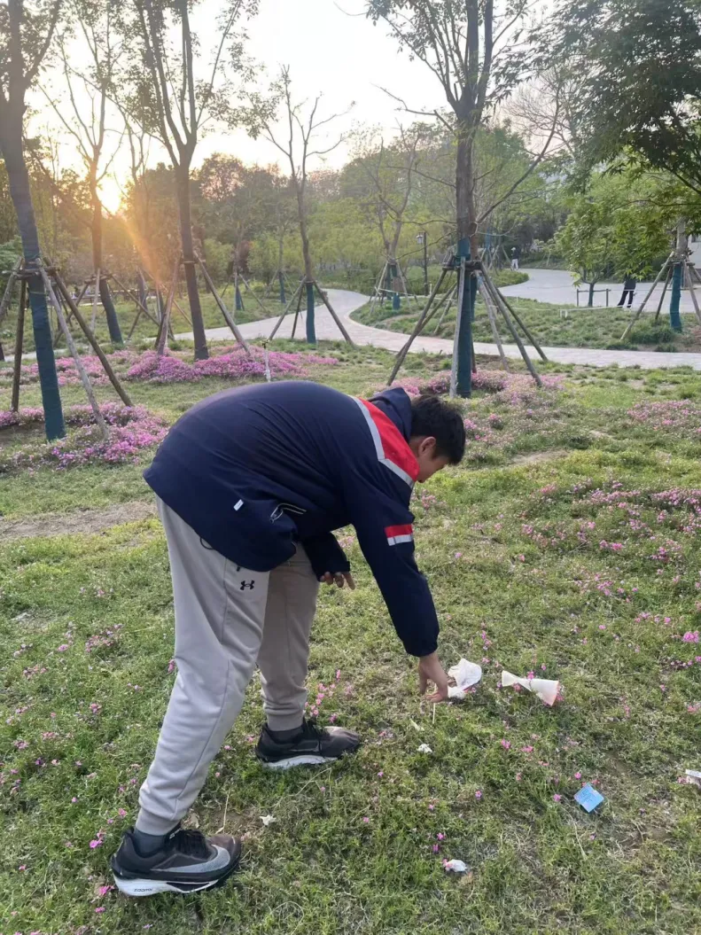 本以为清理工作会顺利进行,意外却接连而来。脚下一滑,我重心不稳,重重摔倒在地,沾满了尘土与污泥。挣扎着起身时,又不小心踩中一瓶未喝完的饮料,黏稠的汁水溅满校服,厌恶的情绪瞬间涌上心头。但我没有就此放弃,依旧一次次弯腰,一点点捡拾,耐心清理着这片脏乱的区域。就在我低头的瞬间,妈妈用相机悄悄定格下了这一幕。