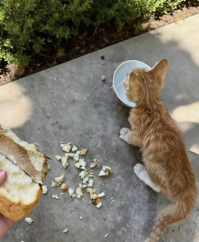 “不要害怕!”我将面包分成好几小块,小心翼翼放在灌木丛外,随后缓缓起身,向后挪去。小猫先是警惕地嗅了嗅,轻轻地推了推眼前的面包,然后大口大口地吃了起来。或许是感到了温暖,它原本紧张的眼神变得放松,我也长舒了一口气,静静看着它。