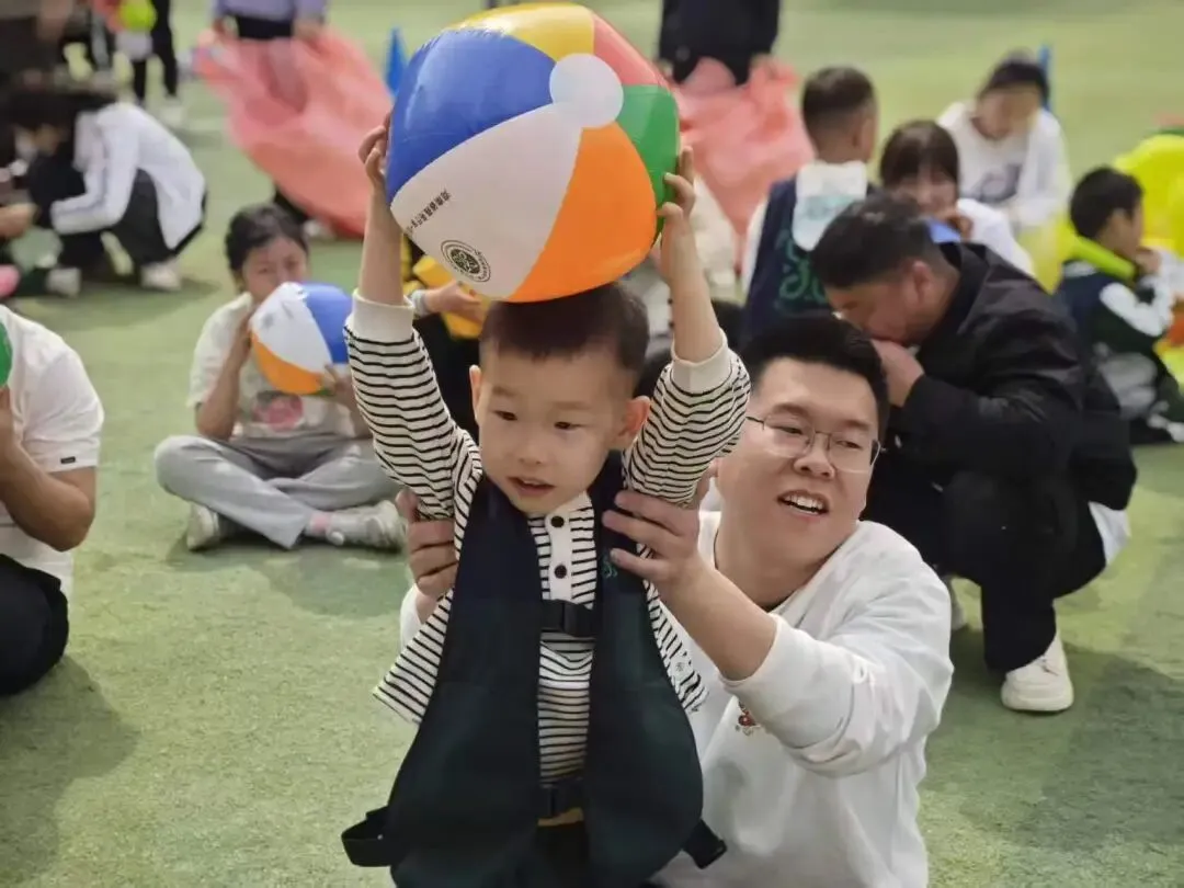 家长与宝贝两两组队,共同手持接球托具,稳稳护住彩色沙滩球,并肩向前奔跑冲刺。