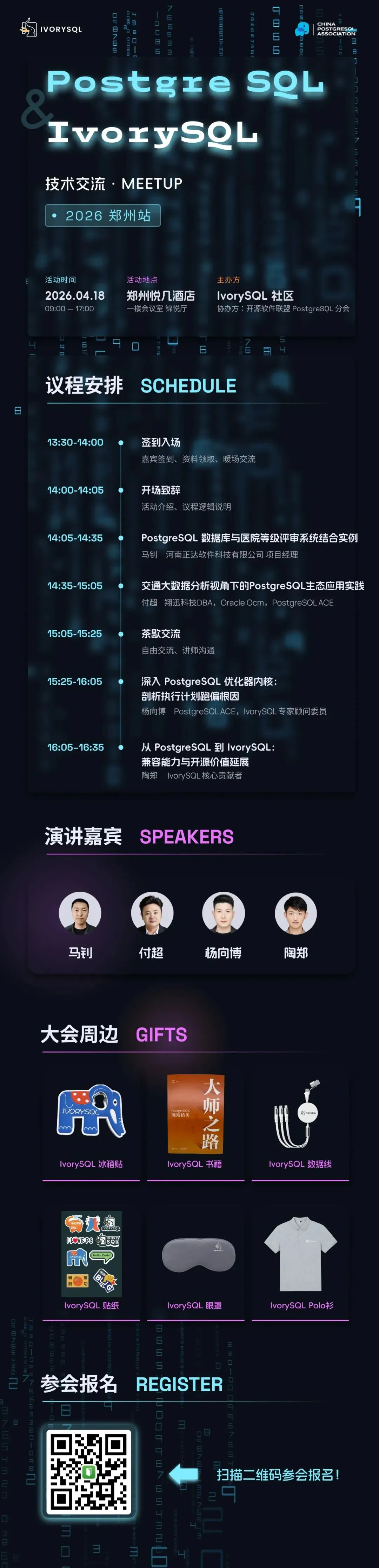 4 月 18 日,郑州相聚,与同频技术人一起聊 PG 生态,探 IvorySQL 实践,共筑中原地区开源数据库技术交流圈,提前解锁 HOW 2026 大会技术氛围。