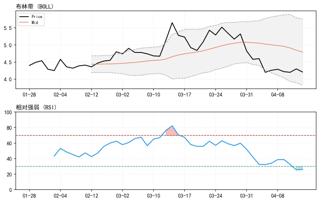 如果股价能够站稳在5日均线上方并持续收复失地,则可能形成短期反转信号,但需要成交量有效配合。当前最新收盘价在4.21元附近,相较于20日均线4.792元仍有明显距离,显示出空头压力依然存在。不过值得注意的是,RSI指标已经从低位回升至26.106,表明市场情绪有所改善,主力可能在逐步收集筹码。KDJ指标的K值和D值均处于低位,暗示市场存在一定的反弹动能,但J值仅为6.99,表明多头力量尚未完全释放。若能突破布林带下轨3.825元,则说明主力可能正在尝试打开新的空间,但需要警惕MACD柱的负值仍处于较高水平,表明空头动能尚未完全消退。