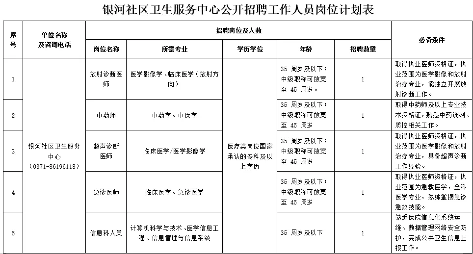 具体招聘岗位、任职要求、计划招聘人数等详细情况,详见《银河社区卫生服务中心公开招聘工作人员岗位计划表》(附件1)。