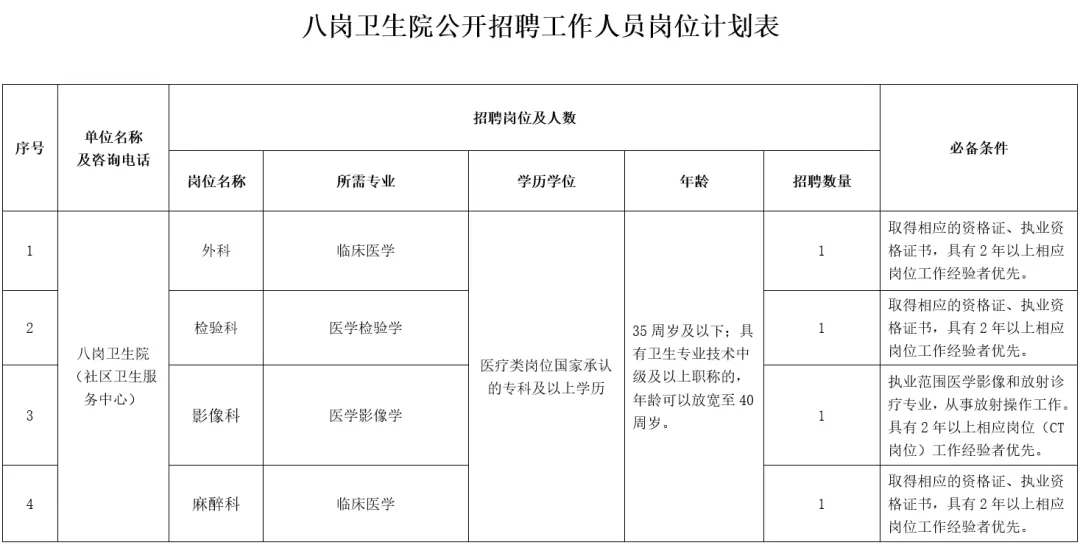 具体招聘岗位、任职要求、计划招聘人数等详细情况,详见《八岗卫生院公开招聘工作人员岗位计划表》(附件1)。