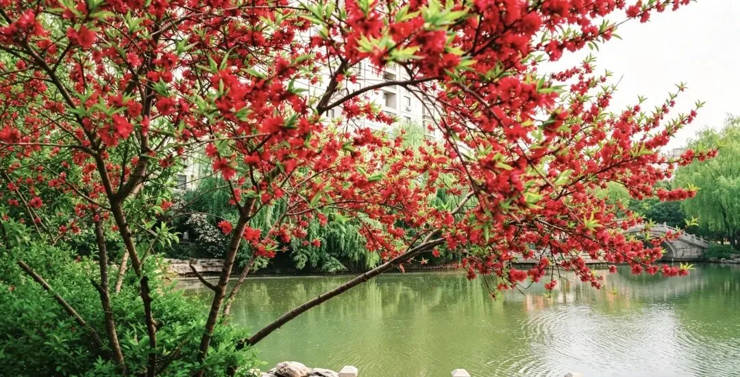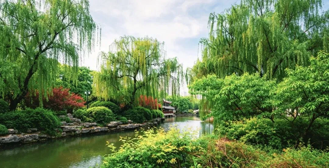 绕过古色古香的建筑,湖边的垂柳早已抽出嫩黄新芽,长长的枝条垂在水面,风一吹便轻轻摇曳,漾开一圈圈温柔的涟漪。