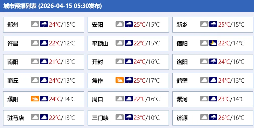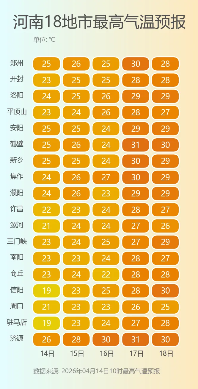 ⭐4月14日,据河南气象消息,整体来看未来五天,河南大部的气温稳中有升,尤其是周五,午后30℃的最高气温将在西北部等地开始冒头。最低气温则会逐渐向15℃靠拢。详情>>