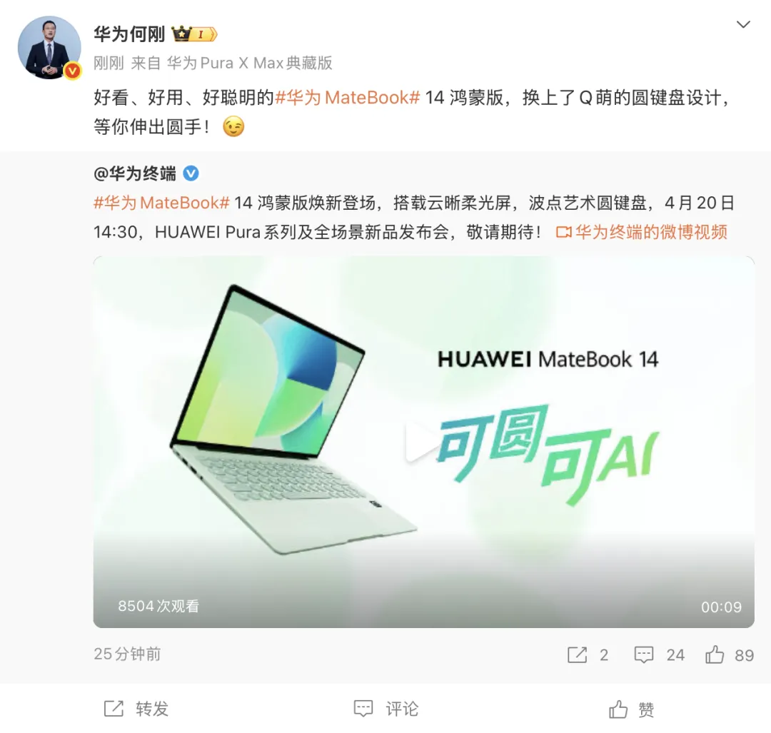 ⭐4月14日,华为终端发布新款鸿蒙电脑预热信息,官宣华为新款鸿蒙电脑将于4月20日发布。详情>>