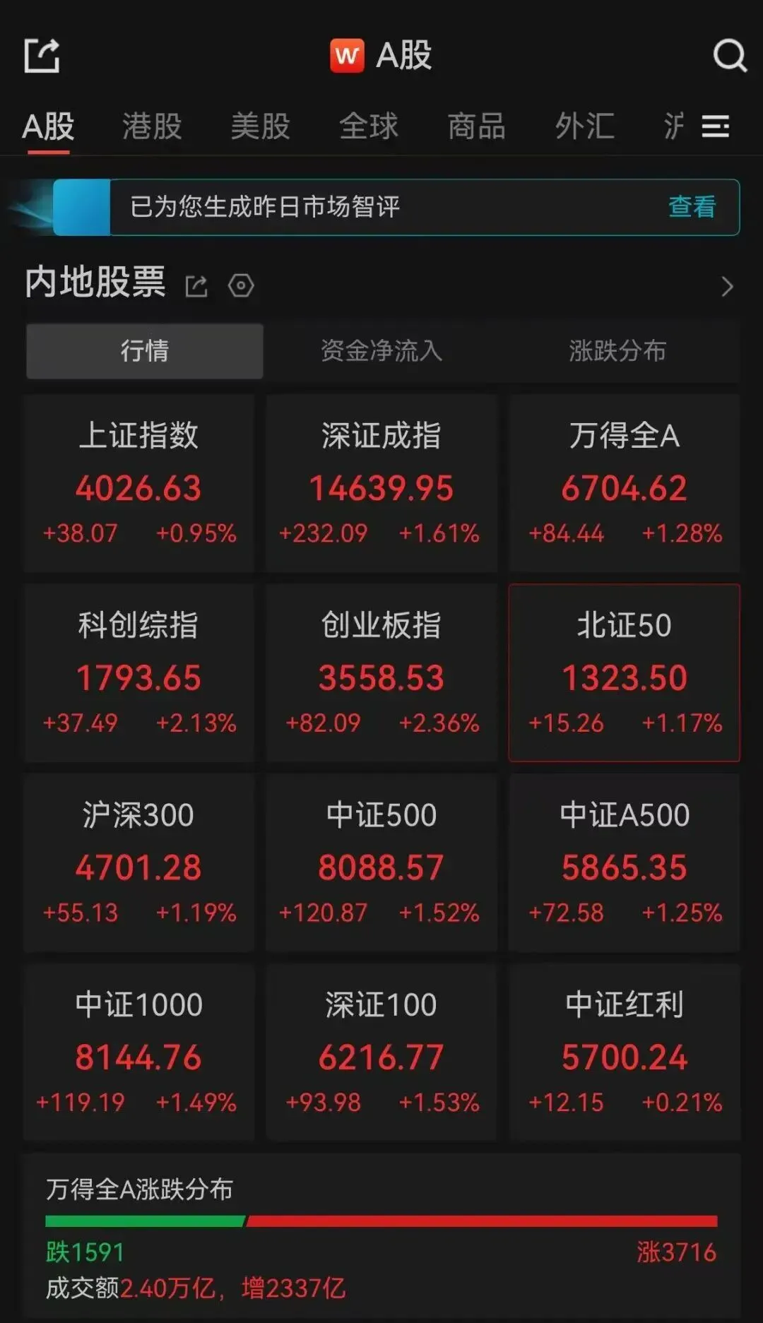 4月14日,A股三大指数高开高走,集体收涨。数据显示,截至收盘,上证指数涨0.95%,站稳4000点;深证成指涨1.61%,创业板指涨2.36%。全市成交额2.40万亿,超3700只个股上涨。详情>>