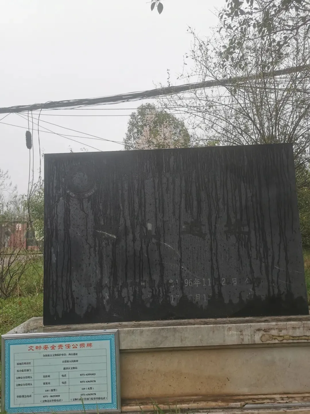 看到这个黑色石碑。上面文字漫漶,看不清,仅从左下那块《文物安全责任公示牌》上内容,推测出这就是“西山遗址”文物保护碑了。郑州西山遗址位于河南省郑州市惠济区,是仰韶文化时期(公元前5000年至3000年)的圆形城址,距今5300—4800年,是中原地区最早的史前城址之一。