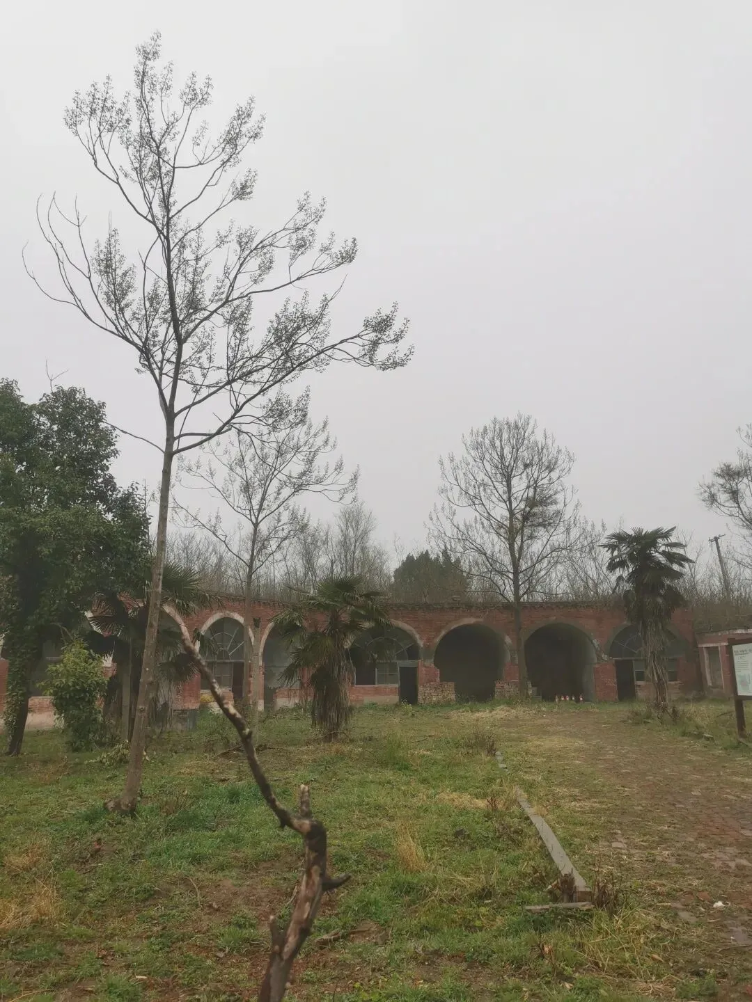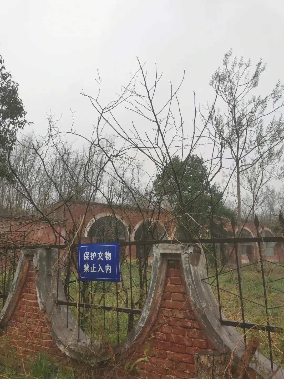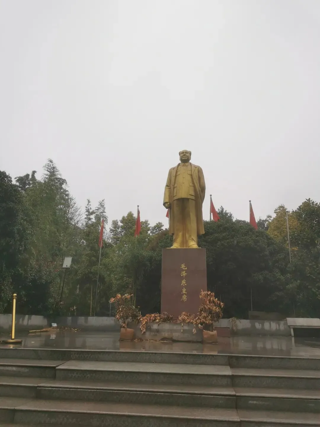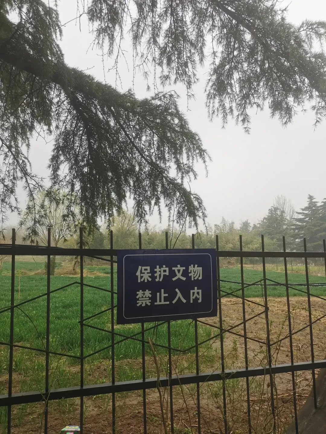 往前走,看见一大门紧锁的院落,“保护文物,禁止入内”。隔着铁栅栏,可以看到里面有一排拱圆门红房子,不知干啥用。手机伸进栅栏缝隙,拍到院子里立有两个宣传牌,不知宣传什么内容。找不到入口,只好拍了几张遗址外围的土堆及土堆上的树及裸露的树根。返回时,看到保护区内有农户种有庄稼和蔬菜。既然农户可以进去,一定另有入口。往前走,是两棵枯枝新绿大柳树。周围阒无一人,再往前走已无路径,看见远处有土砖瓦堆堆在前面。心生惧意,只好折身返回。兴致勃勃去看西山遗址,结果看了个“寂寞”!心想,这就是“全国重点文物保护单位”吗?难道被遗忘或被遗弃了吗?看过很多文物“国保”单位,大多保护得“高大上”,是一方金字招牌;游人如织,有专人管理维护。到了西山遗址,咋就差别那么大呢?所好回来路上,顺道看了这个村的仿古“永明门”和毛主席巨大雕像,也算弥补了些许遗憾。