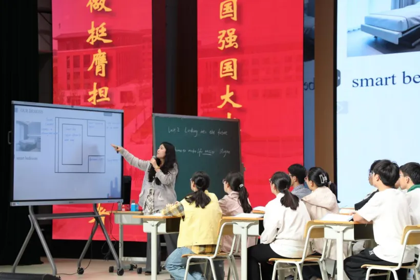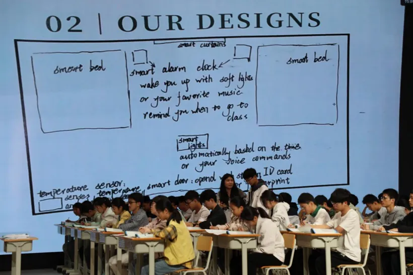 读后阶段,李老师引导学生以教材中的智能家居为例,设计并画出智能教室、智能宿舍以及智能图书馆。其过程深入贯彻了可视化的方法,让学生潜移默化将繁杂的文本信息转化为图像。接着,两位同学用简洁明了的语言来介绍自己设计出来的智能宿舍和智能图书馆,将课堂还给了学生,让学生成为课堂的主人。最后的环节李老师引导学生思考智能设备的局限性,极大地培养了学生的批判性思维。