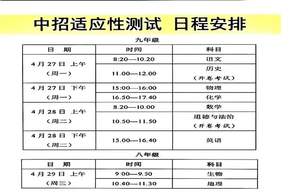 2026年郑州市中招适应性测试、安阳一模、开封一模考试时间及日程安排