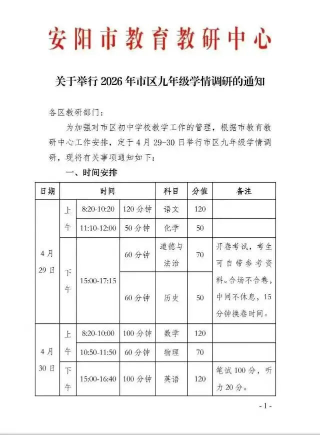 >2026年郑州市中招适应性测试、安阳一模、开封一模考试时间及日程安排