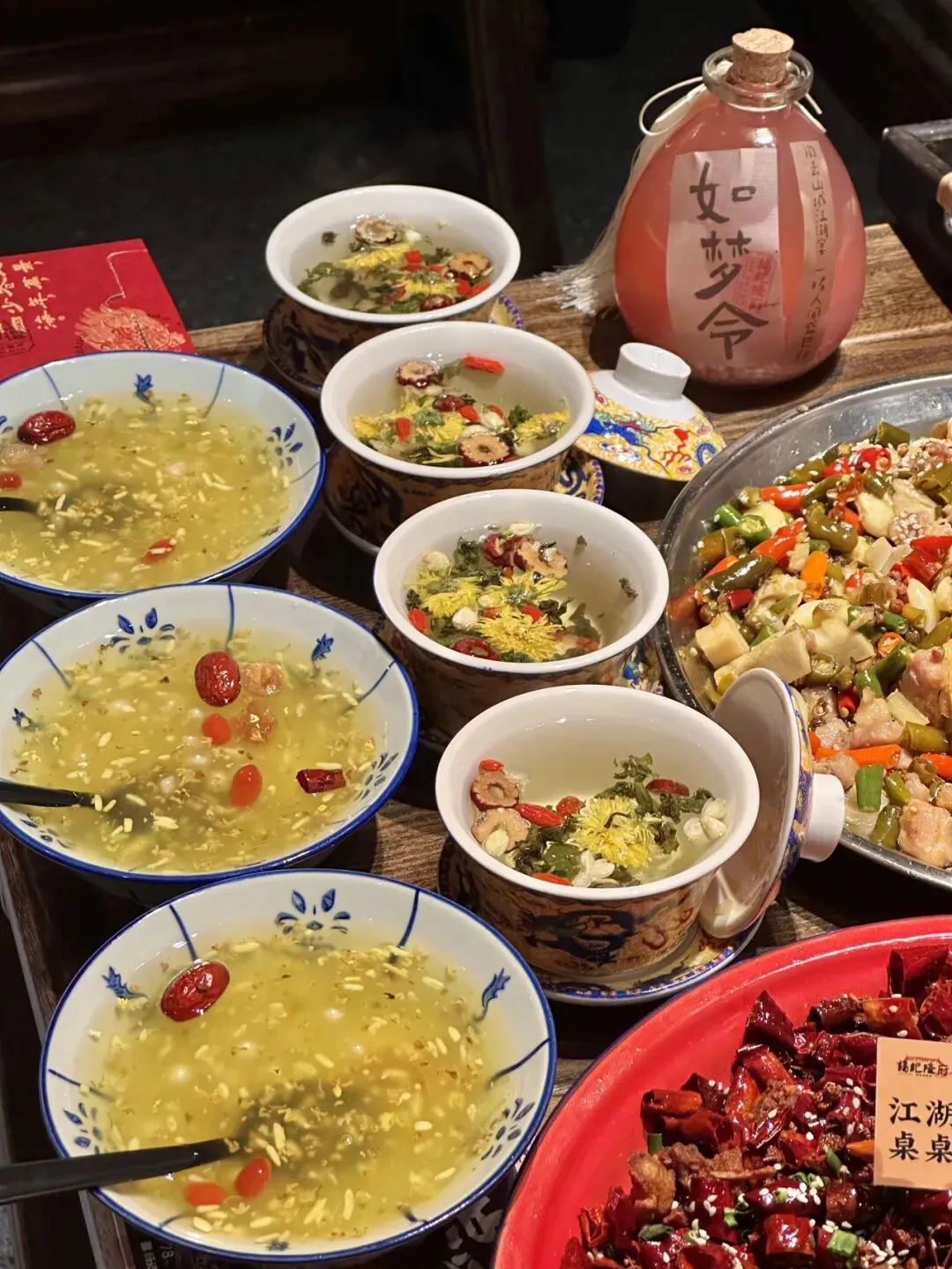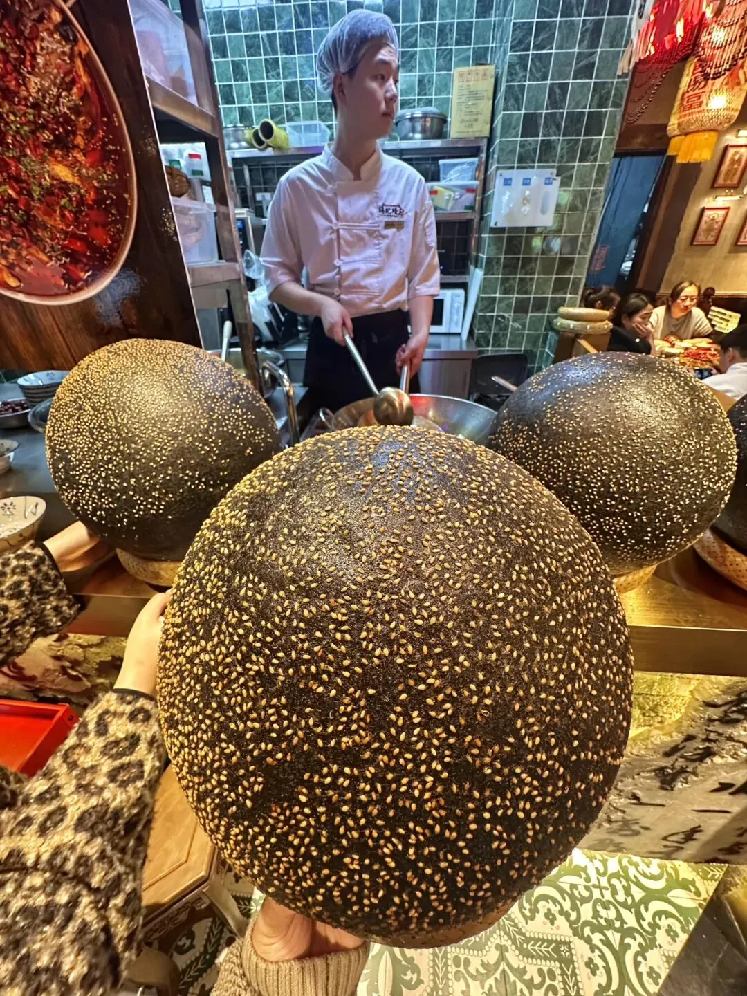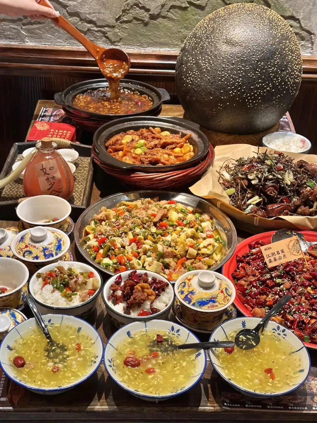 巨大版的!麻团 !plus!!!现场表演的八宝茶!!ju香!!!黄金大麻球都是现炸的!🌕酥酥脆脆的!这么大的麻圆还是第一次见!老味道茶香鸭!重庆味道辣子鸡!还有民国霸王兔!!都是招牌!😭每个都量大 好吃!!闭眼点都不踩雷!红糖阴米粥黏糊糊的!一个人喝了一大碗!🍯打卡 song的冰粉也可好吃!🍮-