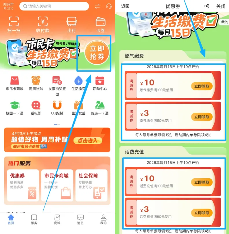 ①郑州新一期生活缴费优惠券,今天上午10点开抢,满100-10/满50-3,郑州市民卡app顶部banner进入抢,燃气费/话费可用