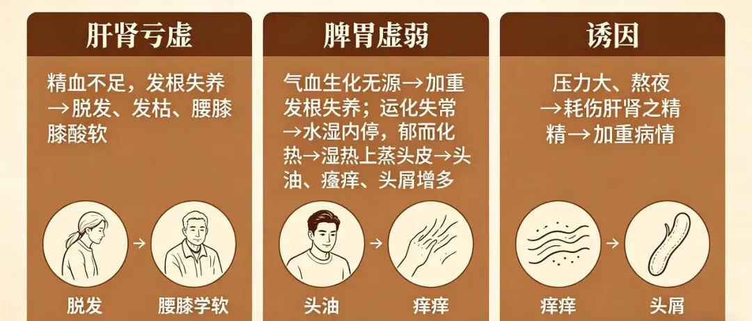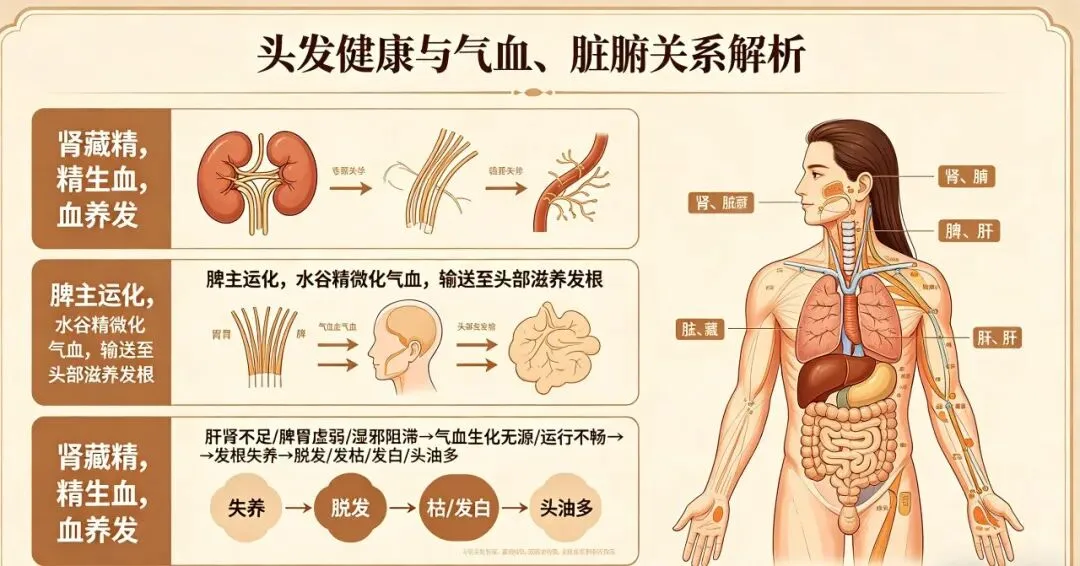中医认为,头发的生长、荣枯,全赖气血滋养,而气血的生成依赖脾胃运化,气血的固摄、滋养则依赖肝肾。肾藏精,精能生血,血能养发,故有“发为血之余,肾之华在发”之说;脾主运化,将水谷精微转化为气血,源源不断输送至头部,滋养发根;若肝肾不足、脾胃虚弱,气血生化无源,或湿邪阻滞、气血运行不畅,发根失养,便会出现脱发、发枯、发白、头油多等问题。