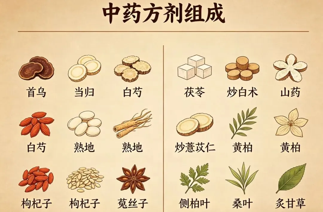 制何首乌、熟地、枸杞子、菟丝子滋补肝肾、益精养血,为养发之核心,从根源上补充发根所需营养