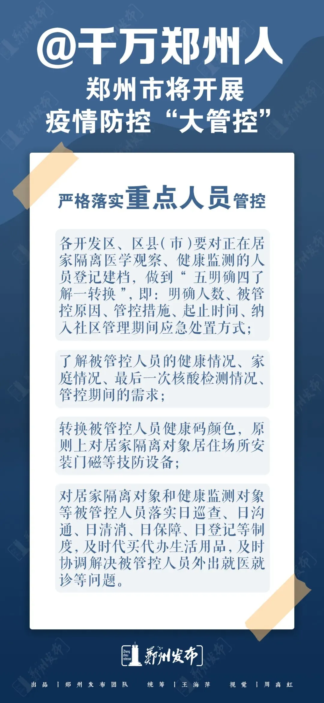 严格落实重点人员管控。对正在居家隔离医学观察、健康监测的人员登记建档,做到“五明确四了解一转换”,即:明确人数、被管控原因、管控措施、起止时间、纳入社区管理期间应急处置方式;了解被管控人员的健康情况、家庭情况、最后一次核酸检测情况、管控期间的需求;转换被管控人员健康码颜色。