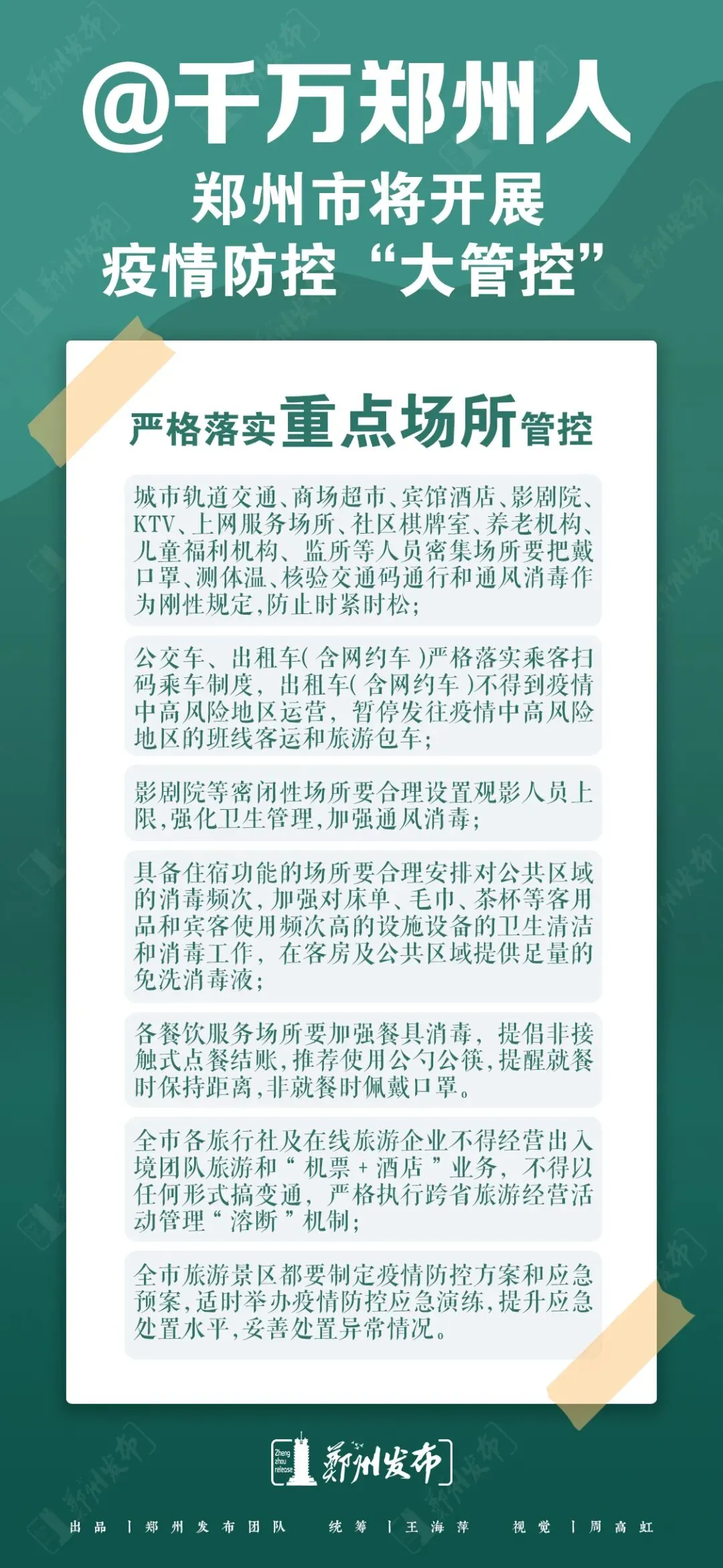 严格落实重点场所管控。城市轨道交通、商场超市、宾馆酒店、影剧院、KTV、上网服务场所、社区棋牌室、养老机构、儿童福利机构、监所等人员密集场所要把戴口罩、测体温、核验交通码通行和通风消毒作为刚性规定,防止时紧时松。公交车、出租车(含网约车)严格落实乘客扫码乘车制度,出租车(含网约车)不得到疫情中高风险地区运营,暂停发往疫情中高风险地区的班线客运和旅游包车。影剧院等密闭性场所要合理设置观影人员上限,强化卫生管理,加强通风消毒。各餐饮服务场所要加强餐具消毒,提倡非接触式点餐结账,推荐使用公勺公筷,提醒就餐时保持距离,非就餐时佩戴口罩。全市各旅行社及在线旅游企业不得经营出入境团队旅游和“机票+酒店”业务,不得以任何形式搞变通。严格执行跨省旅游经营活动管理“熔断”机制。全市旅游景区都要制定疫情防控方案和应急预案,对省外来郑游客,要查验48小时内核酸检测阴性证明方可入内;严格落实游客健康码查验、检测体温、规范佩戴口罩等要求。