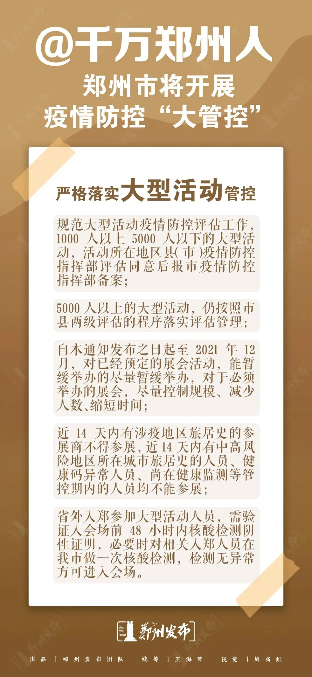 严格落实大型活动管控。规范大型活动疫情防控评估工作,1000人以上5000人以下的大型活动,活动所在地区县(市)疫情防控指挥部评估同意后报市疫情防控指挥部备案;5000人以上的大型活动,仍按照市县两级评估的程序落实评估管理。自本通知发布之日起至2021年12月,对已经预定的展会活动,能暂缓举办的尽量暂缓举办,对于必须举办的展会,尽量控制规模、减少人数、缩短时间。