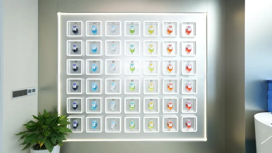 踏入前厅,映入眼帘的是一面极具辨识度的彩色输液袋展示墙。中投装饰以定制化的嵌入式灯槽设计,将不同色彩的输液袋规整陈列于白色方框内,暖光从背后晕染开来,让每一个输液袋都成为空间的艺术展品,直观展现了品牌视觉符号,成为空间的点睛之笔。