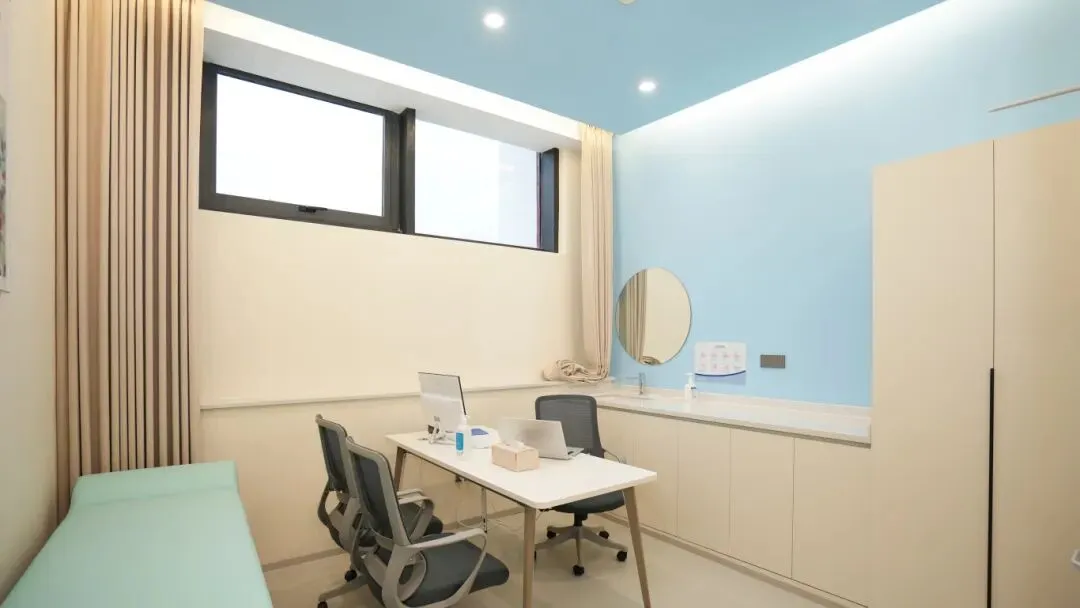 诊室空间,中投装饰延续了整体的色彩体系,浅蓝色的墙面搭配米白色的柜体,干净明亮。诊疗床、办公桌椅、洗手台等功能区布局合理,既满足了医生的诊疗需求,又保证了患者的隐私。